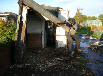 Before you start, consider placing your shed on a free recycling website. Be careful the walls of the shed don’t immediately fall down when taking the roof off.